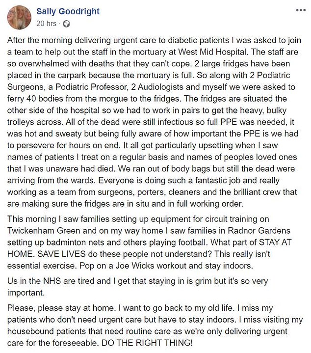 Ms. Goodright, who works as a podiatry assistant, told in a Facebook post that after delivering urgent care to diabetic patients, she joined five people to move 40 bodies of coronavirus victims.