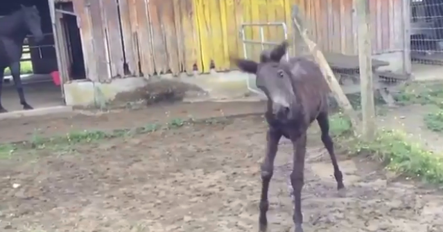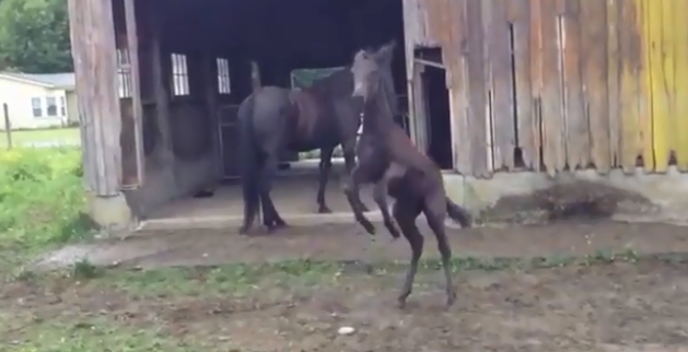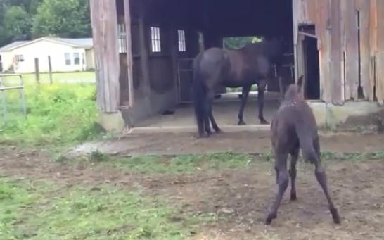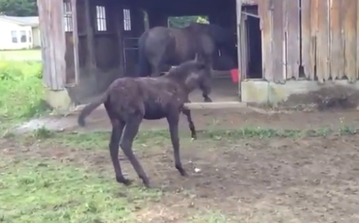 Look at this adorable video of Raven who is standing right out of the stable on the farm without a care in the world. Her mother is right behind her, having a meal.