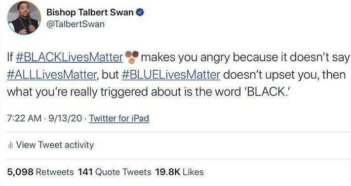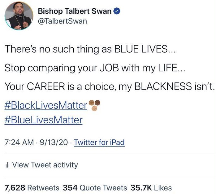 Less than an hour after his initial comment about Blue Lives, Bishop Talbert Swan doubled down on his earlier statement as he slammed people for not seeing “the hypocrisy in expressing outrage” over the LA officers that got shot.