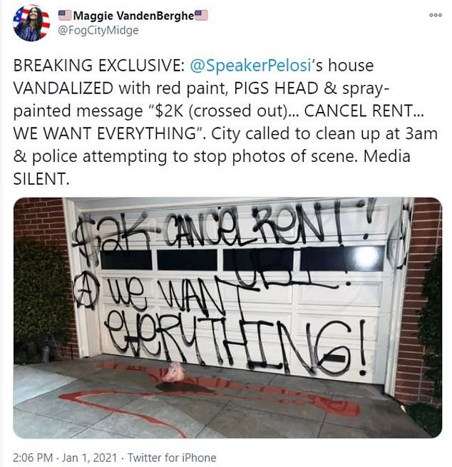 Nancy Pelosi’s home was vandalized with graffiti and a pig’s head on New Year’s Day.