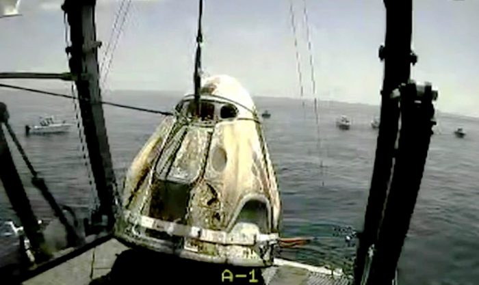 .@AstroBehnken and @Astro_Doug have been lifted out of the water and are aboard the Go Navigator. Welcome home. #LaunchAmerica pic.twitter.com/gjqUcLMy8X
