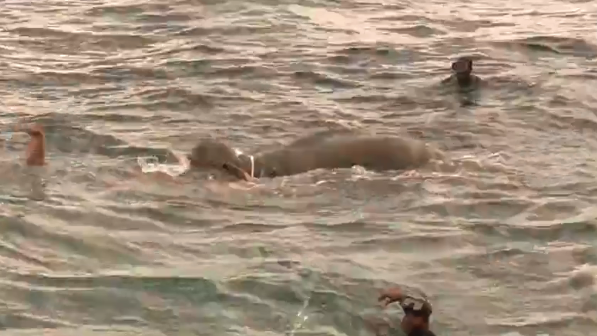 By the time boats reached the animal, it was visible that the elephant had left no strength of swimming in the sea.
