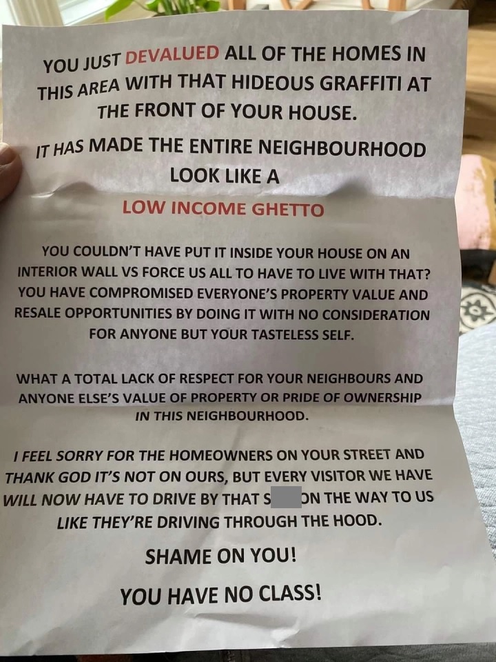 “You just devalued all of the homes in this area with that hideous graffiti at the front of your house. It has made the entire neighbourhood look like a low income ghetto.