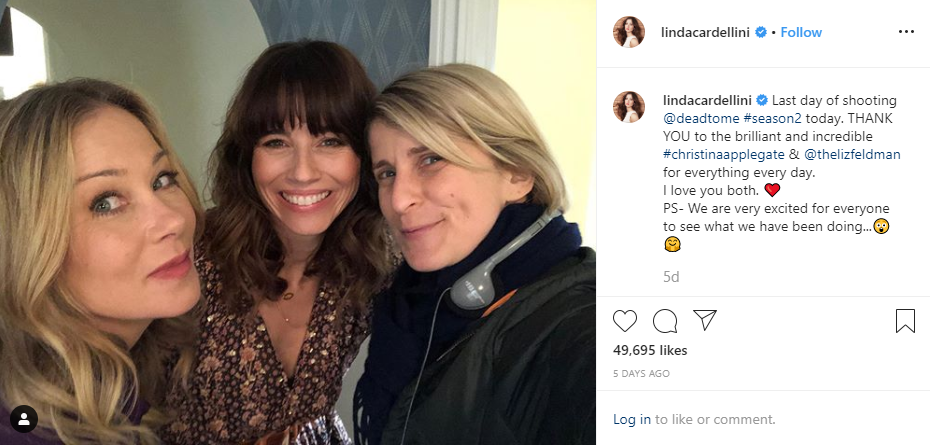 Cardellini shared a photo of herself with the show’s producer Liz Feldman and co-star Christina Applegate on Instagram, captioning it: “Last day of shooting @deadtome #season2 today.