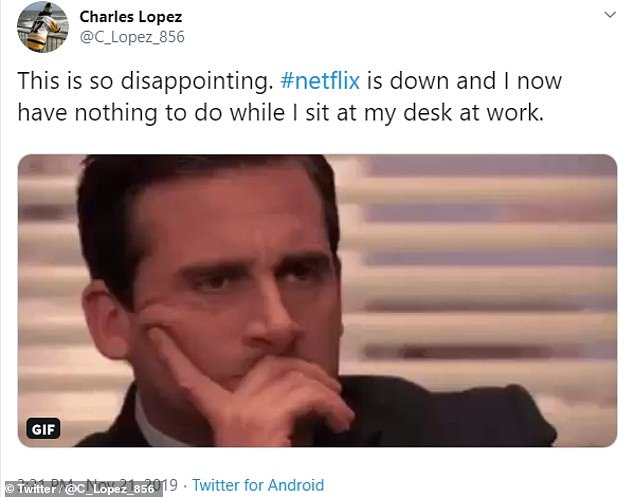 A person named Charles Lopez wrote: “This is so disappointing. Netflix is down and I now have nothing to do while I sit at my desk at work.”