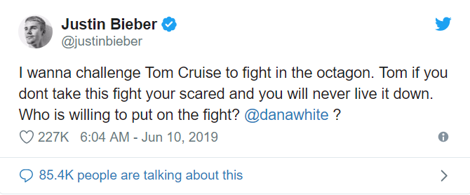 Justin Bieber had challenged Tom Cruise for a fight in the Octagon on June 10 via his Twitter account. He tweeted saying that he wanted to ‘challenge’ Tom Cruise for a fight and if Tom didn’t take this challenge, it means that he is sacred and would not be able to live with it.