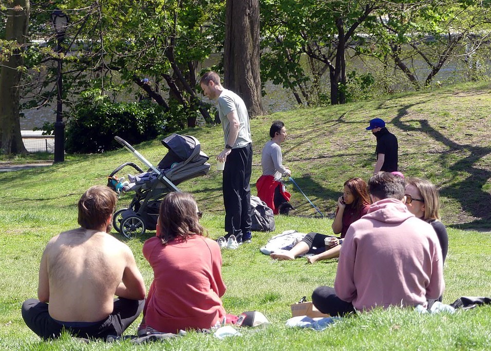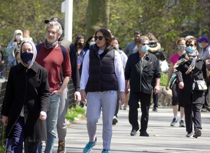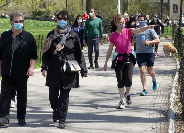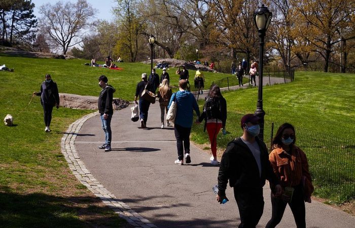 Photos from the Sunday afternoon where temperatures hit 61 degrees show New Yorkers strolling around, some with masks while others not wearing any face coverings, despite being warned by authorities that coronavirus can spread via respiratory droplets that enter the body via nose, mouth, and eyes.