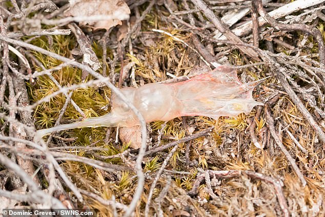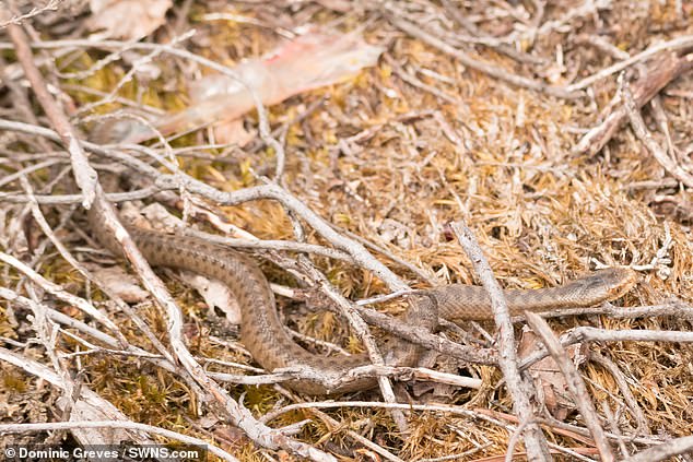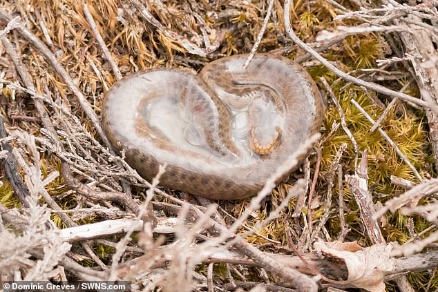 He said: “We saw an adult female adder lying in the heather which moved away after it was spotted. Soon afterwards one of our group spotted a baby adder writhing around in a transparent sac where the female had been lying.”