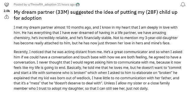 A woman is taking the world by storm by speaking about how her dream lover is keen on her giving up her child, whom she shares with another man, up for adoption.