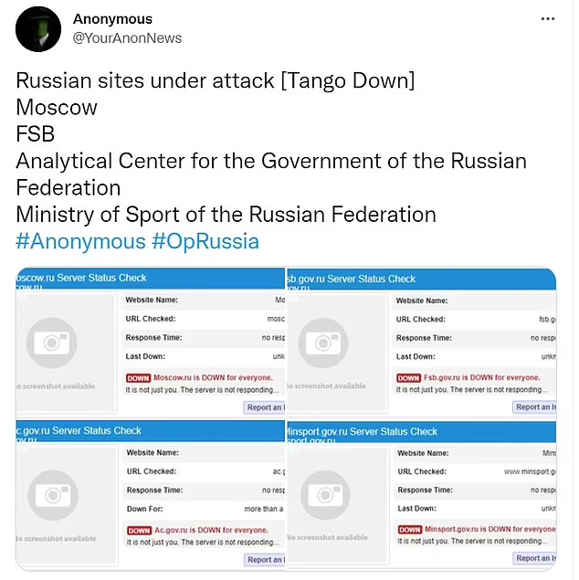 Taking to Twitter to announce their achievement, the hacktivists – who declared cyberwar against Russia following Putin’s invasion of Ukraine – claimed they brought down four major Russian sites including that of the country’s intelligence service.
