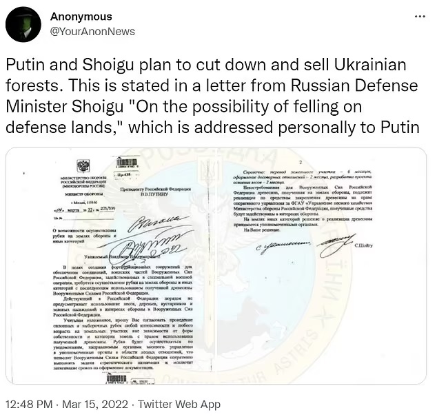 The confidential paper adds that the income generated from the sales of Ukrainian wood will be used for Russia’s “interests of defense.”