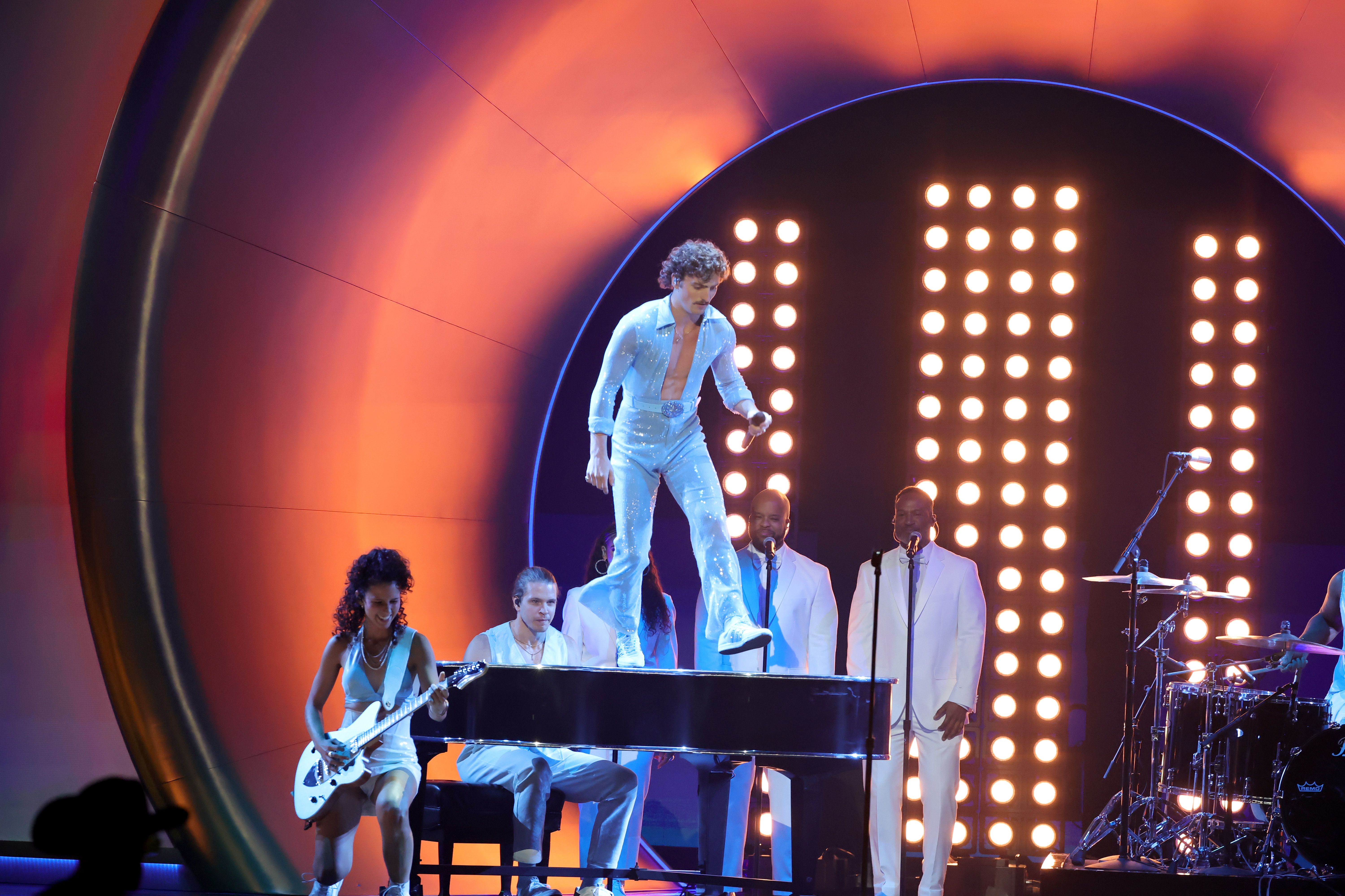 Think along the lines of giving out a full blown performance on stage while donning a Blue Benson Boone’s sequinned jumpsuit.