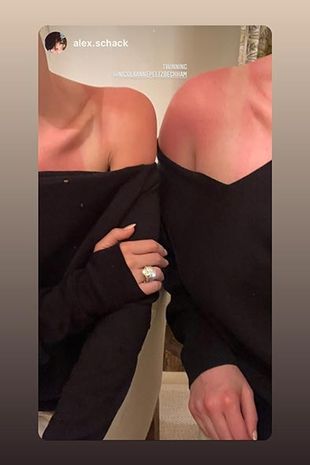 Another photo shows Nicola showing off her sunburn and a huge diamond ring on her ring finger.