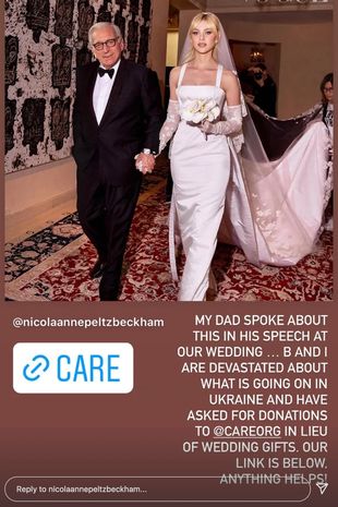 “My dad spoke about this in his speech at our wedding… Me and Brooklyn are devastated about what is going on in Ukraine and have asked for donations to CareOrg in lieu of wedding gifts,” she wrote in an emotional post on Instagram.