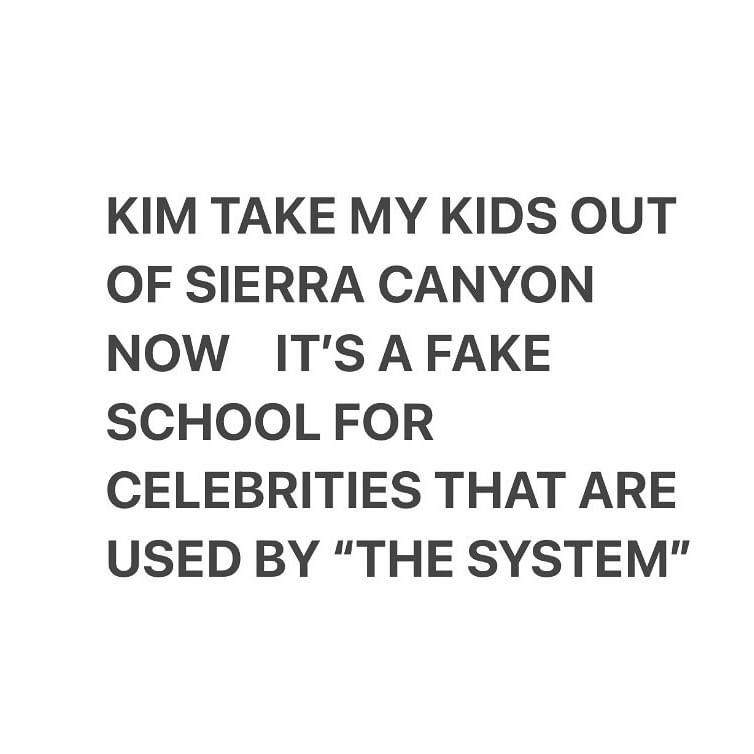 “Kim take my children out of Sierra Canyon right now. It’s fake for celebs and it’s used for the system”- the very controversial rapper mentioned in capital locks while speaking through his account on Instagram during the later hours of Wednesday night.