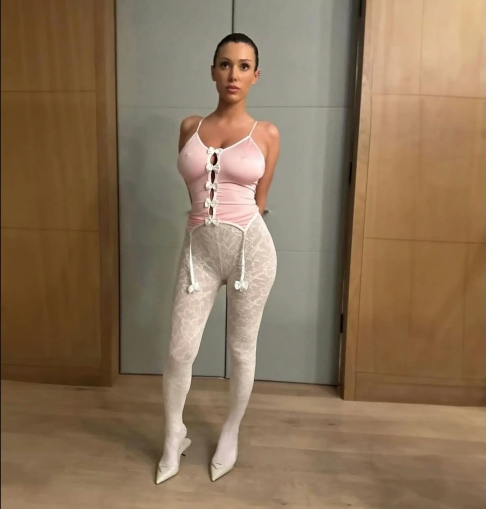 Censori covered all of her arms with a sheer white long-sleeved cardigan which was somehow styled to make it off the shoulders so that most of her skin was on display.
