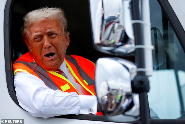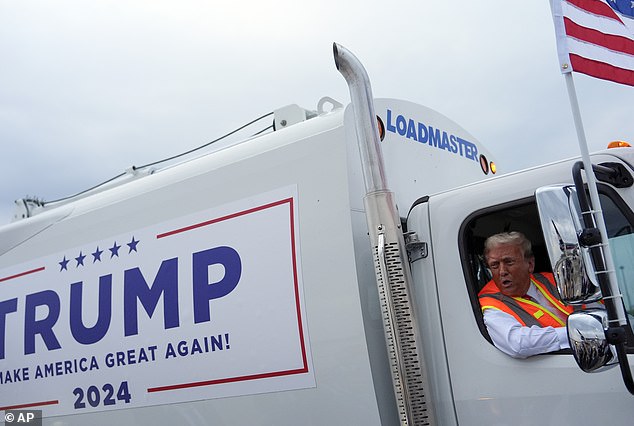 Donald Trump was seen trolling Joe Biden and Kamala Harris by riding the MAGA garbage truck.