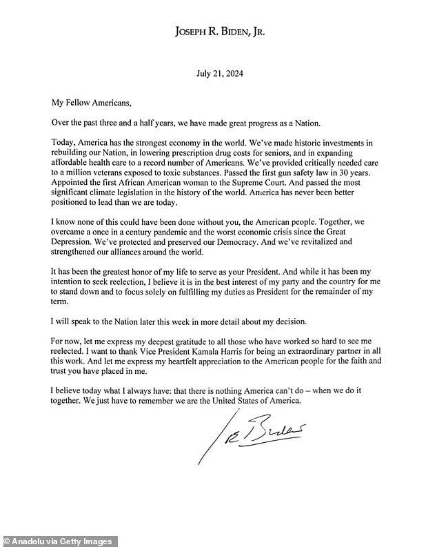 Biden made the historic decision to step aside in a one-page-long document where he committed to completing his term.