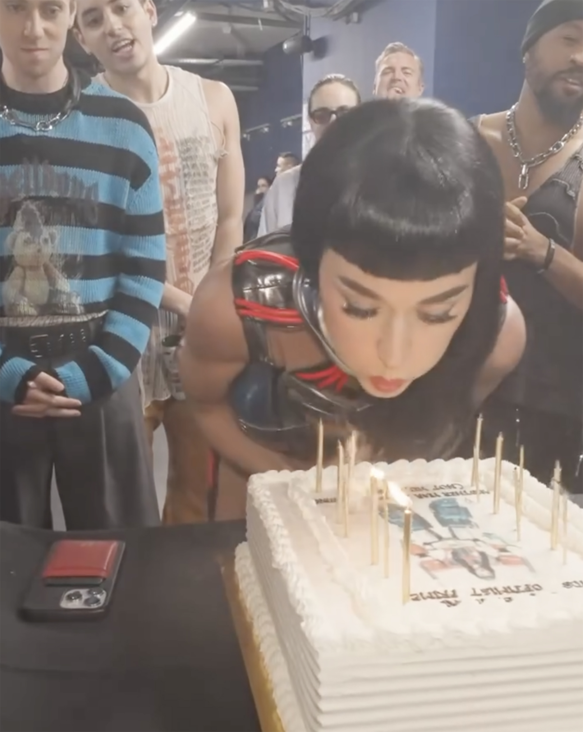 Still dressed in her costume from the show, the star was filmed surrounded by her crew members as she blew out the candles on a large sheet cake.