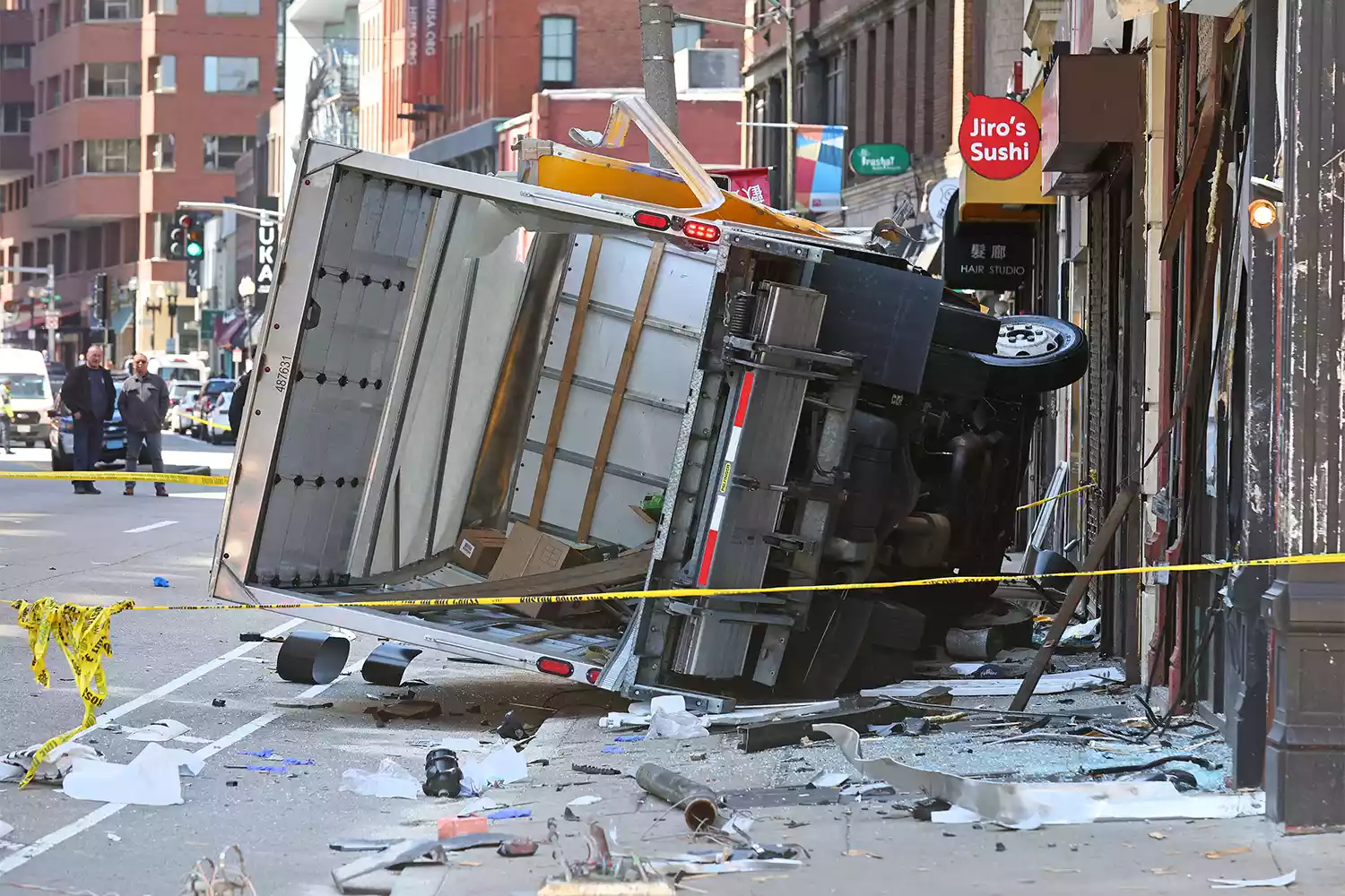 A box truck was seen crashing into a busy street on Tuesday in Boston.