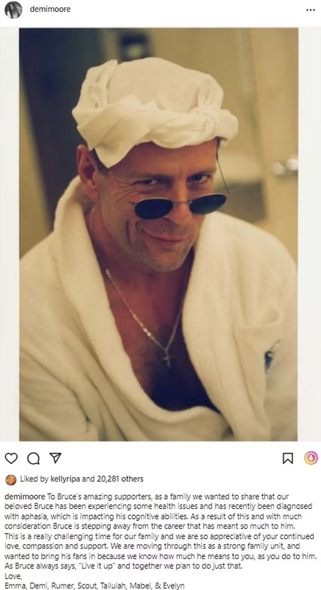 “To Bruce’s amazing supporters, as a family we wanted to share that our beloved Bruce has been experiencing some health issues and has recently been diagnosed with aphasia, which is impacting his cognitive abilities,” Bruce’s family – including his wife Emma Hemming, ex-wife Demi Moore, and his five daughters – said in a joint statement.