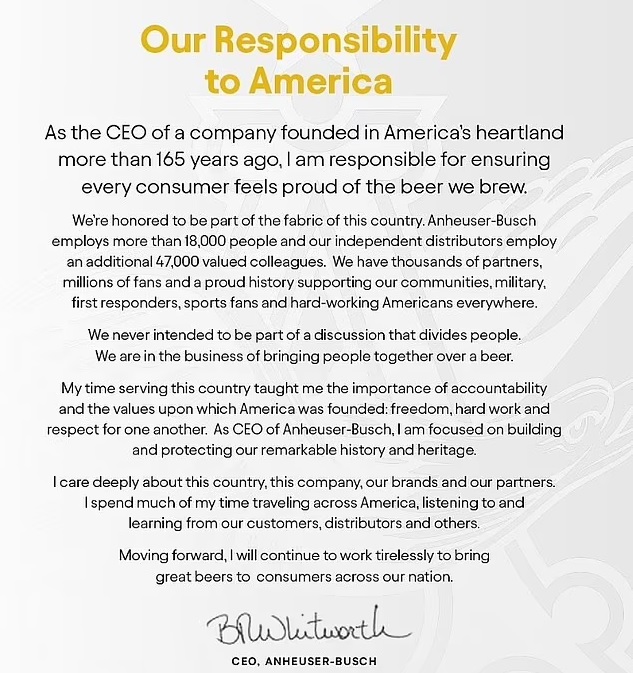 “My time serving this country taught me the importance of accountability and the values upon which America was founded: freedom, hard work and respect for one another. As CEO of Anheuser-Busch, I am focused on building and protecting our remarkable history and heritage.”