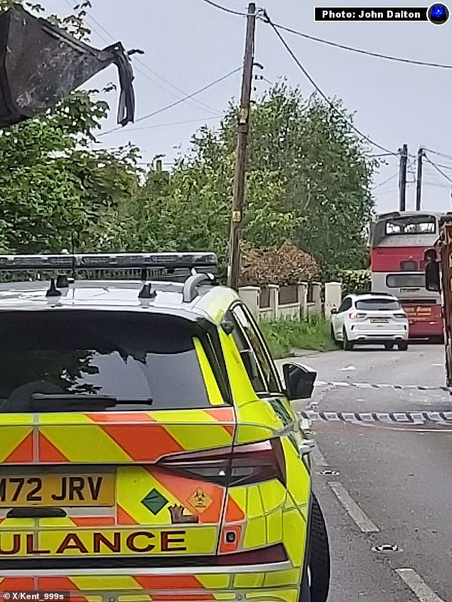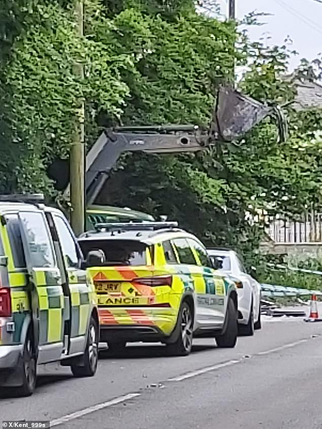 Images also revealed how the tractor was involved in the crash nearby where its scoop happened to be raised up high in the air.