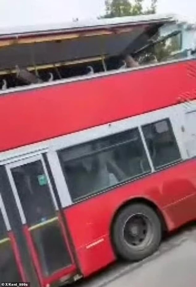 The vehicle’s top floor was completely sliced open, showing how bad the force from the accident was.