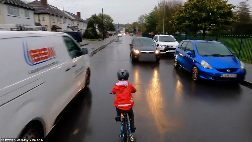 A father has left social media divided after putting up footage of his 5-year-old son riding a bike with a car driving too close to him.