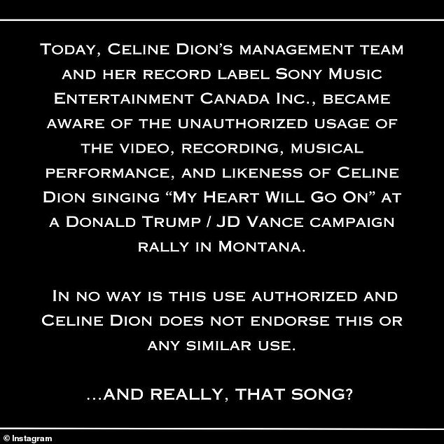 ‘In no way shape or form is this use authorized and Celine Dion is not happy. She does not endorse this or anything similar to this- the statement by the star’s management team mentioned, alongside the label Sony.