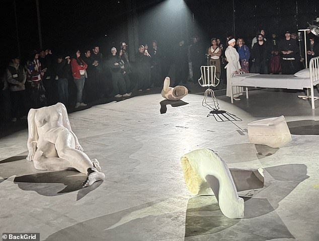 The duo took part in a bizarre live artsy event at the Koreatown warehouse that’s located in Los Angeles. While there was no stage, just the floor, several odd props took center stage.