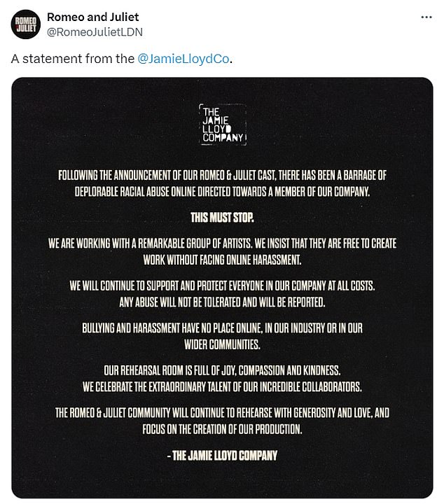 Tom Holland’s co-star in the newly released trailer for the West End production of Romeo and Juliet has triggered a barrage of online haters.