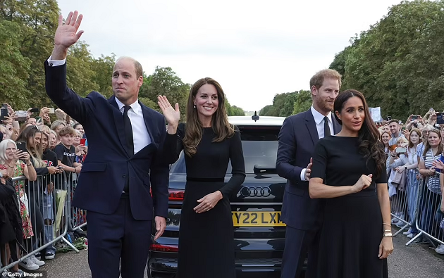 William and Harry and their wives Kate and Meghan went on a 40-minute walkabout to meet well-wishers and inspect the floral tributes laid outside the gates of Windsor Castle.