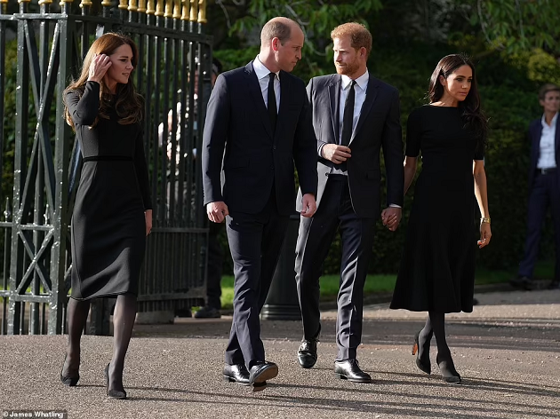 The Prince and Princess of Wales and the Duke and Duchess of Sussex were seen together again as they walked outside Windsor Castle to inspect the sea of floral tributes for the much-loved Queen.