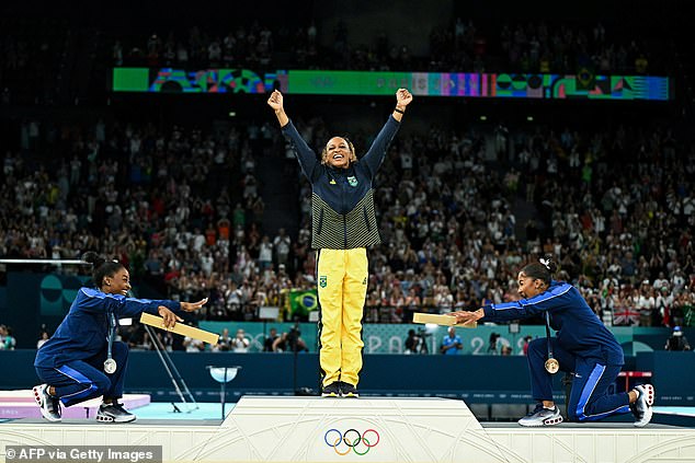 The athletes were unable to attain gold but did manage to get the second and third positions. Hence, during the medal awarding ceremony, they thought it would be a great gesture to show some love to Brazil’s Rebeca Andrade who triumphed over all others to reach the top spot.