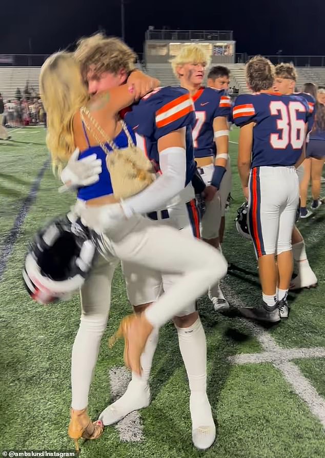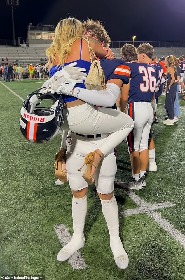 In the video, the son named Brixton is seen picking his mom up for a few seconds, right before she jumps down and finishes congratulating him by shaking his shoulders. Throughout this time, her legs are wrapped around him.