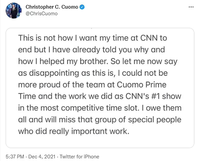 Cuomo acknowledged the termination and expressed regret for his role in the scandal. However, he asserted that he was just helping his brother.