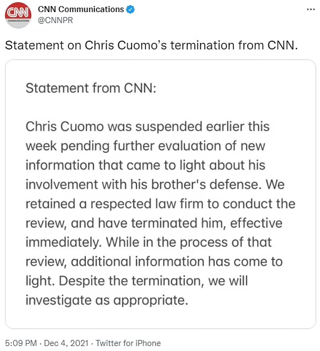 In a statement announced on Saturday, the network said: “Chris Cuomo was suspended earlier this week pending further evaluation of new information that came to light about his involvement with his brother’s defense.”