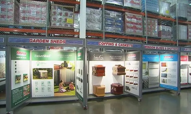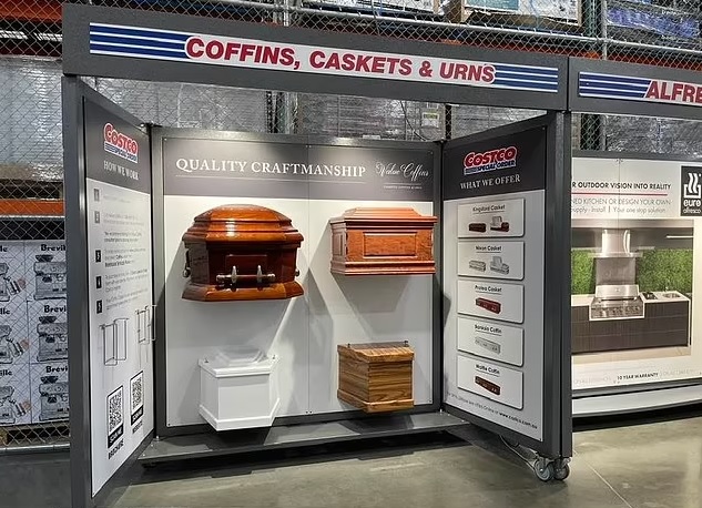 Leaving shoppers stunned, the Costco store in North Lakes, Brisbane, exhibited sample coffins next to ads for barbecues and kitchen design.