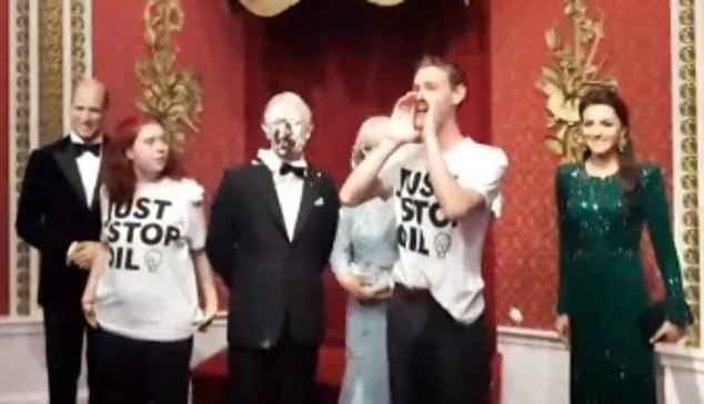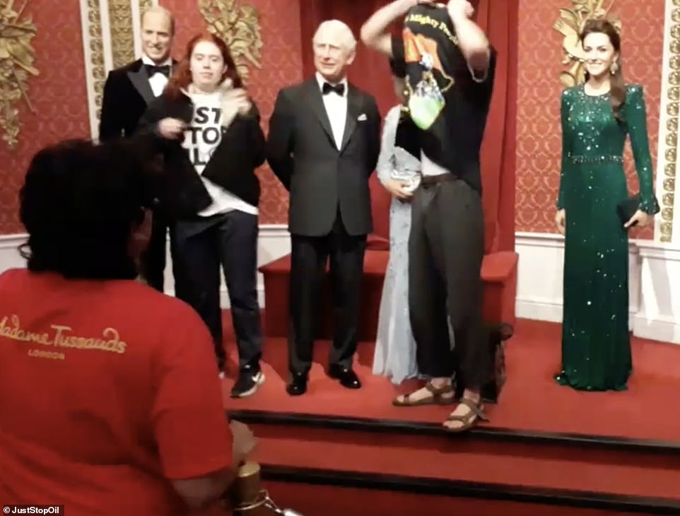 Startling video footage showed ‘Just Stop Oil’ activists smearing chocolate cake across King Charles’ waxwork model at the famous tourist attraction.