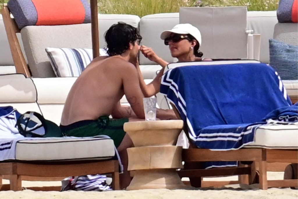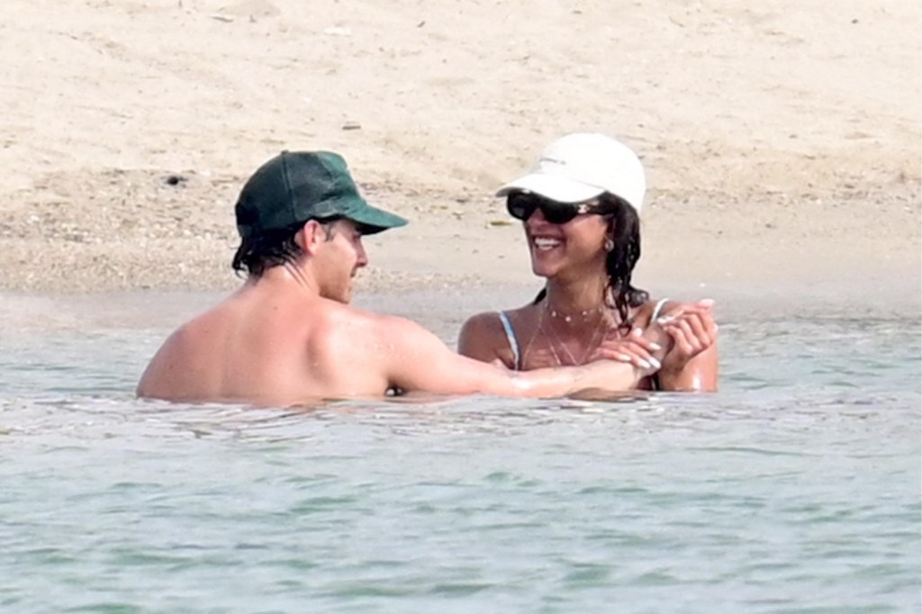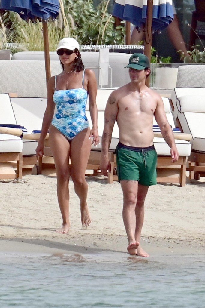 The singer was pictured showing his body in a shirtless swimsuit number featuring green colored swim trunks. This included a matching cap while he hung out in the ocean with the stellar brunette by his side.
