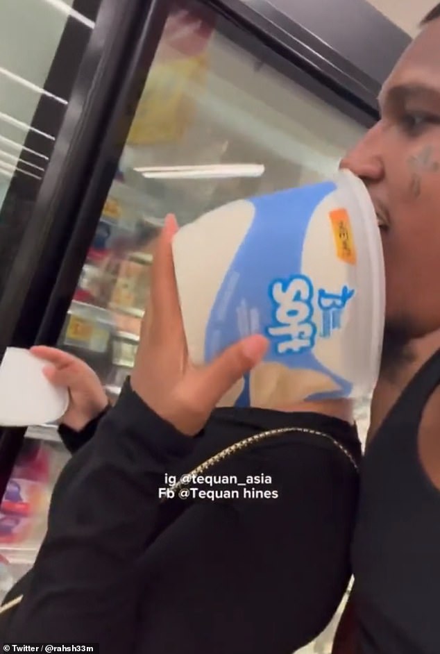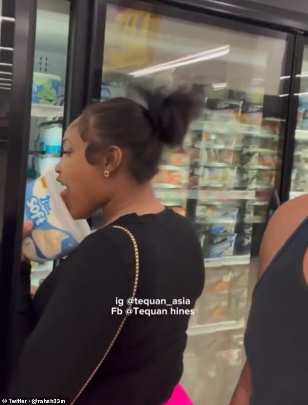 The couple very conveniently looks around and when they see that no one is watching, they go ahead and start to tick out a giant tub of the frozen desserts. And start to lick it up like a dog would.