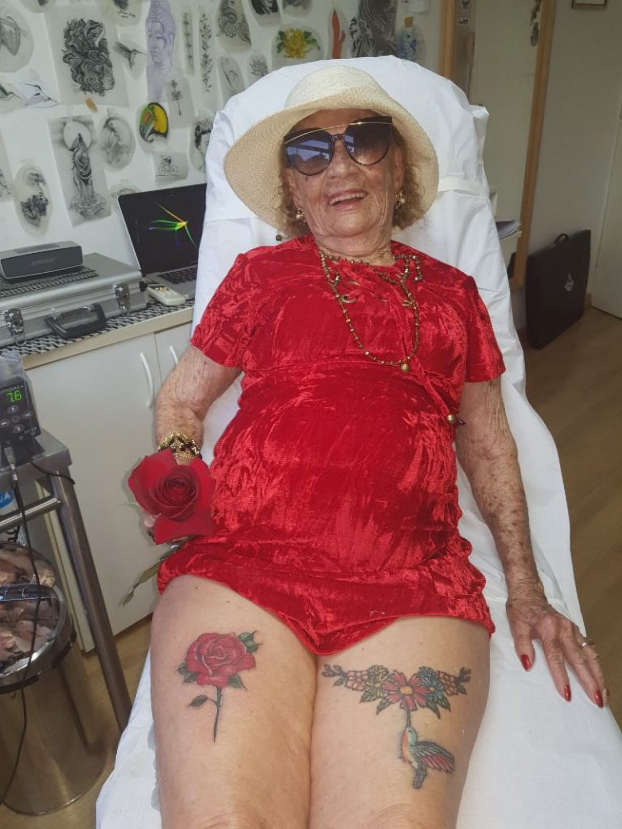 For her recent tattoo procedure, she showed up with one of her grandchildren who calls her immensely brave for putting up with all the pain.