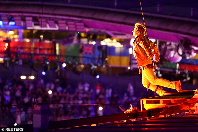 The 62-year-old was seen strapped into a harness and ready to wow thousands of fans in the French capital as the wacky ceremony came to a close.
