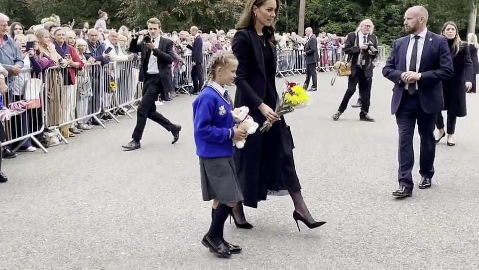 According to local media outlets, Princess Kate was the one who picked 8-year-old Elizabeth from a sea full of people to place her adorable little corgi teddy among the overwhelming sea of bouquets that lay in respect for her Majesty.