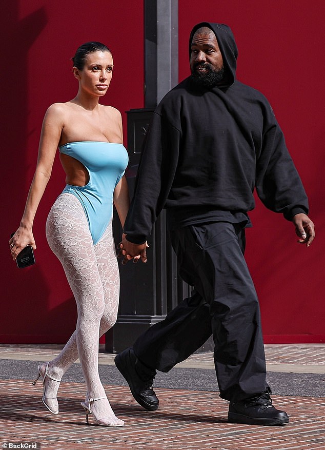 The Yeezy architect opted for a strapless bodysuit with no bra underneath, not to mention how the look was paired with some pantyhose.