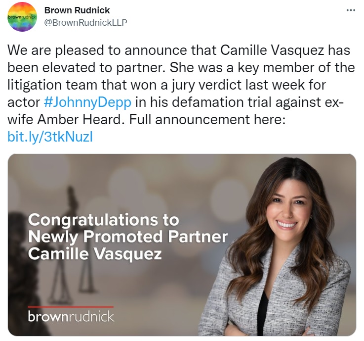 As the firm’s chairman and CEO William Baldiga added in his statement, Camille’s exceptional performance in the Depp-Heard trial was the reason behind the sudden promotion.