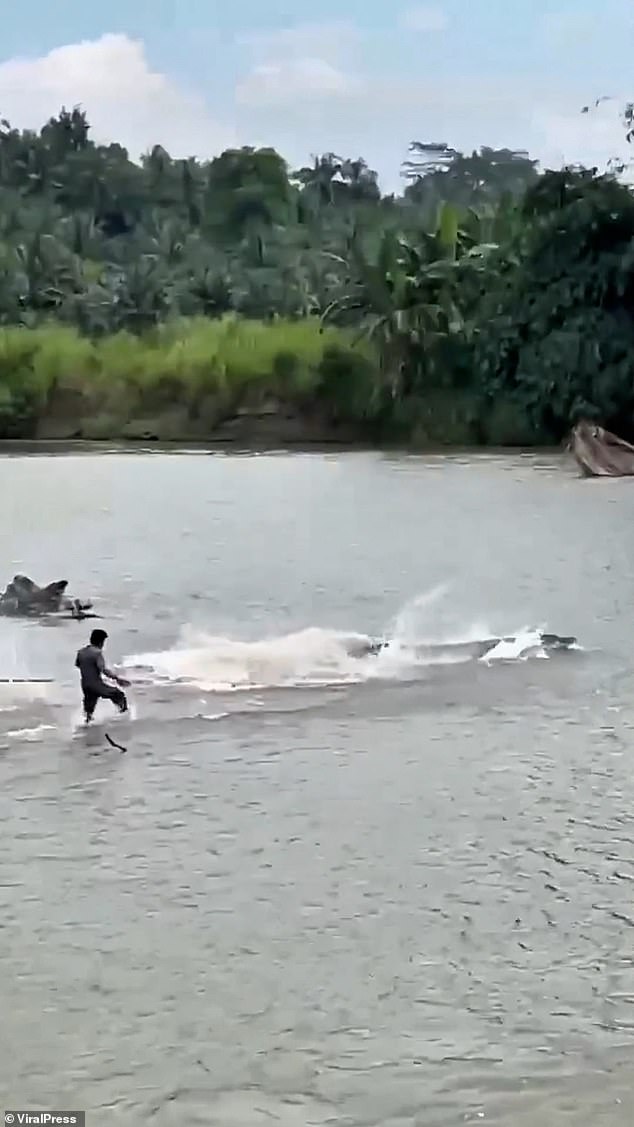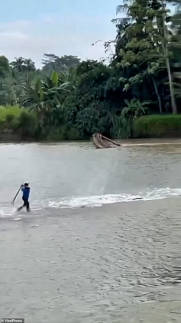 They used sticks and chased it across the banks of the Semaka River in Lampung yesterday.
