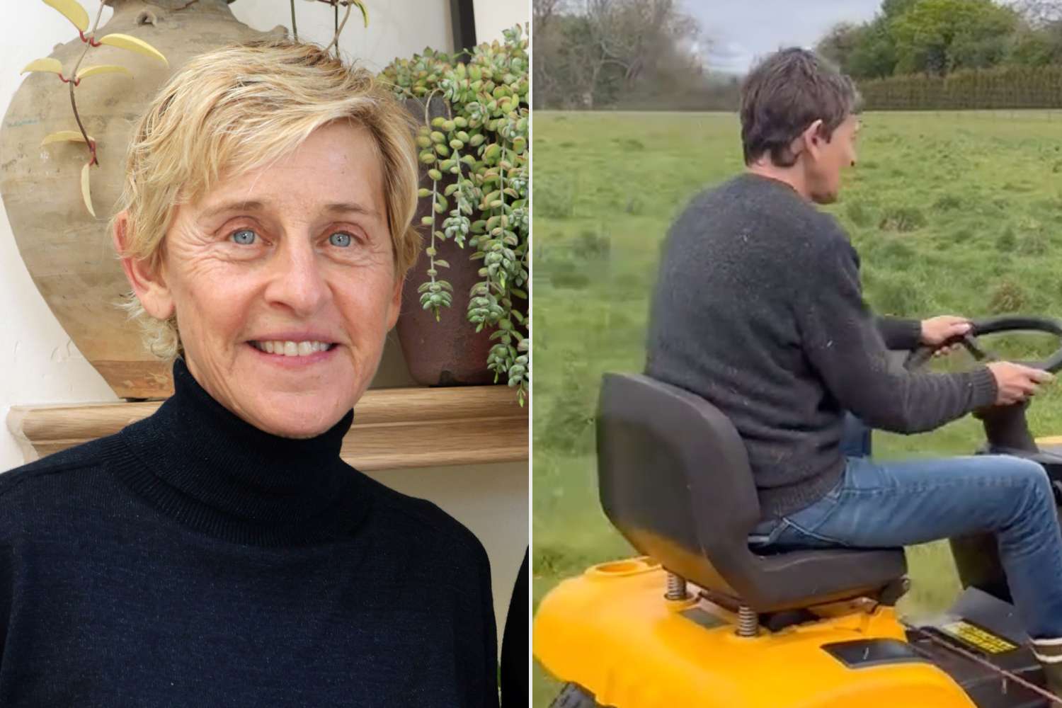 DeGeneres is seen struggling to drive the lawn mower up a hill, and the on-screen caption is seen changing to ‘How it Ended’.