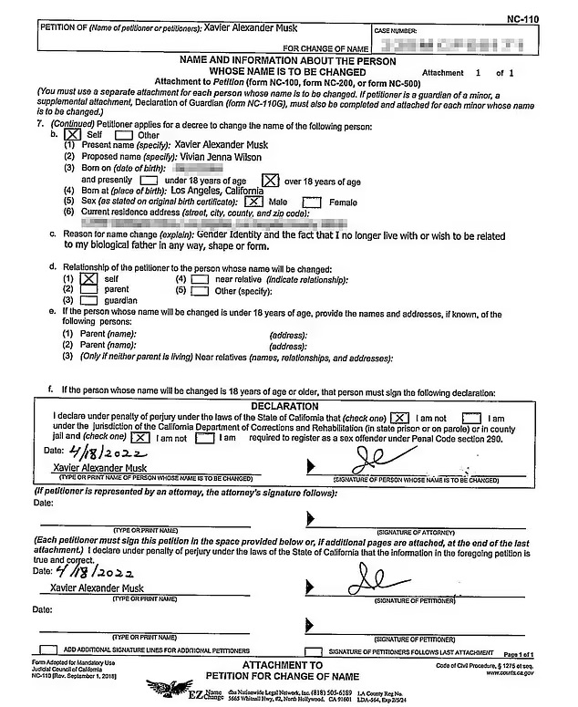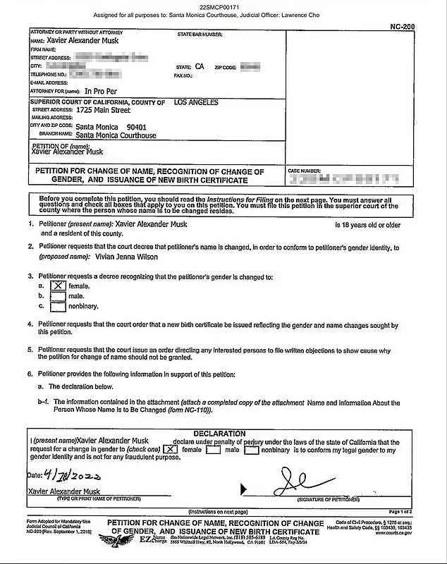 Xavier Alexander Musk, 18, seemingly disowned his father in papers asking for his name and surname to be changed from Xavier Musk to Vivian Jenna Wilson.